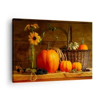 Canvas picture - Autumn composition with pumpkins and flowers on a wooden background - 70x50cm - Rustic Composition - Fruit of Autumn - Modern wall decoration for the living room and bedroom ARTTOR
