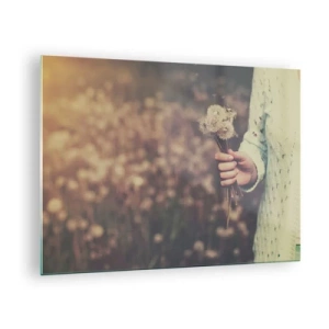 Glass picture - A hand holding a bouquet of dandelions against a blurred field - 70x50cm - Stop Them, Please - Modern wall decoration for the living room and bedroom ARTTOR