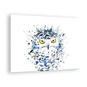 Glass picture - Artistic portrait of an owl with yellow eyes and abstract details. - 70x50cm - Straight in the Eyes - Modern wall decoration for the living room and bedroom ARTTOR