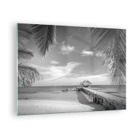 Glass picture - Black and white shot of a tropical beach with a jetty - 70x50cm - Memory or a Dream? - Modern wall decoration for the living room and bedroom ARTTOR