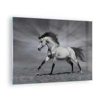 Glass picture - A black and white photo of a horse galloping in an open field. - 70x50cm - Born to Amaze - Modern wall decoration for the living room and bedroom ARTTOR