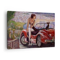 Canvas picture - A woman by a red car with a town in the background - 70x50cm - Summer? Only in Riviera - Modern wall decoration for the living room and bedroom ARTTOR