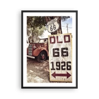Poster in black frame - Oldtimer at the Route 66 sign - 50x70cm - Legend of an American Province - Modern wall decoration for the living room and bedroom ARTTOR