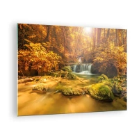 Glass picture - forest stream with waterfalls in an autumn landscape - 70x50cm - Gingerly through an Autumnal Forest - Modern wall decoration for the living room and bedroom ARTTOR