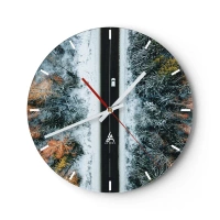 Wall clock - Clock on glass - A forest road in winter seen from a bird's eye view with a car driving by - 30x30cm - Through a Wintery Forest - Modern wall decoration for the living room, kitchen, and bedroom ARTTOR