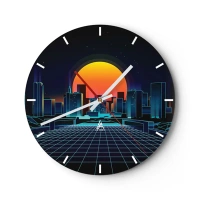 Wall clock - Clock on glass - Retro-futuristic cityscape with neon lights and sunset - 30x30cm - You Wanna Go Back to Reality? - Modern wall decoration for the living room, kitchen, and bedroom ARTTOR