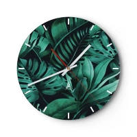 Wall clock - Clock on glass - Tropical green leaves on a dark background - 30x30cm - Depth of Tropical Green - Modern wall decoration for the living room, kitchen, and bedroom ARTTOR