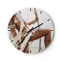 Wall clock - Clock on glass - A stylized figure in ethnic jewelry against a beach background. - 30x30cm - Priestess of the Sun - Modern wall decoration for the living room, kitchen, and bedroom ARTTOR