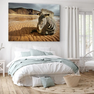 The zebra on the beach motif symbolizes the harmony between wildlife and the tranquility of the seaside landscape. It's a perfect choice for lovers of nature, exoticism, and unique interior decorations. The richness of detail and meticulously rendered textures give the painting a realistic and artistic dimension.