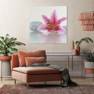 Pink lily flower with stones on a light background is an excellent choice for lovers of subtle and elegant decorations. This canvas painting brings an atmosphere of relaxation, harmony and aesthetics to any interior.