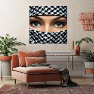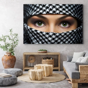 "Portrait of a Veiled Green-Eyed Beauty" is an intriguing canvas print depicting the mesmerizing gaze of a woman hidden behind patterned fabric in classic black and white. The color contrast and the intense green of the eyes attract attention and lend the composition a sense of mystery and elegance.