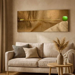 "Summoning the Spirit of William Tell" is an extremely original canvas art print that attracts the eye with its symbolism and minimalism. The central element of the composition is a green apple placed on a pleated fabric in a natural color. An arrow runs through the image, seeming to cut through the space and adding a dynamic accent.