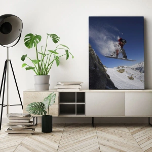 The snowboarder motif symbolizes passion, courage, and freedom. The combination of white snow, blue sky, and dark rocks creates a contrasting and inspiring composition that perfectly suits sporty interiors.