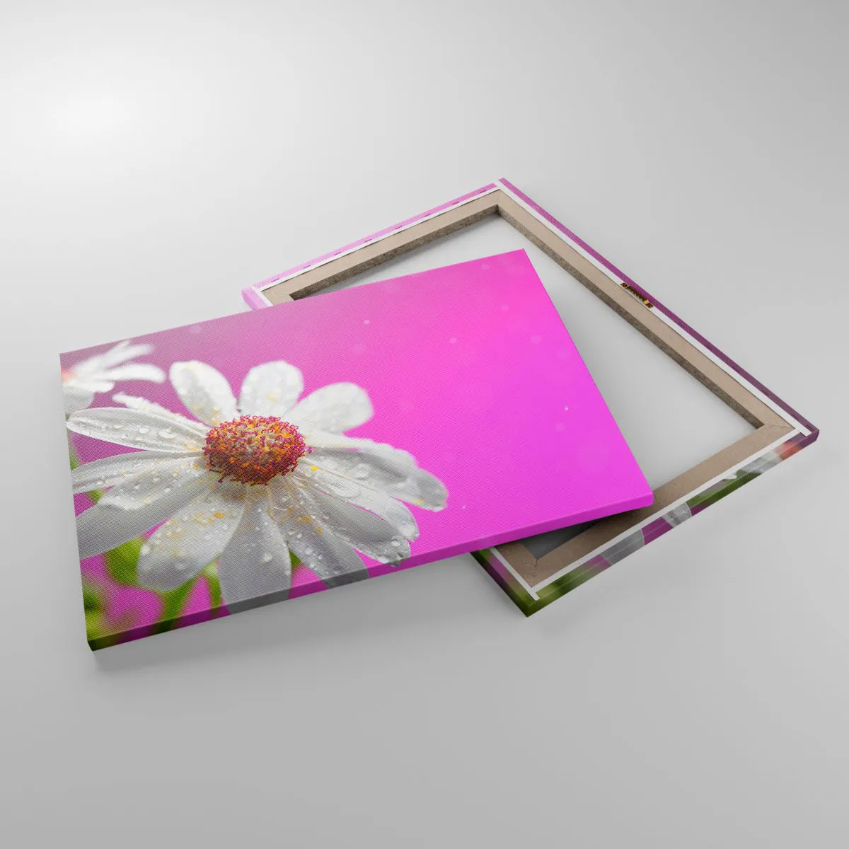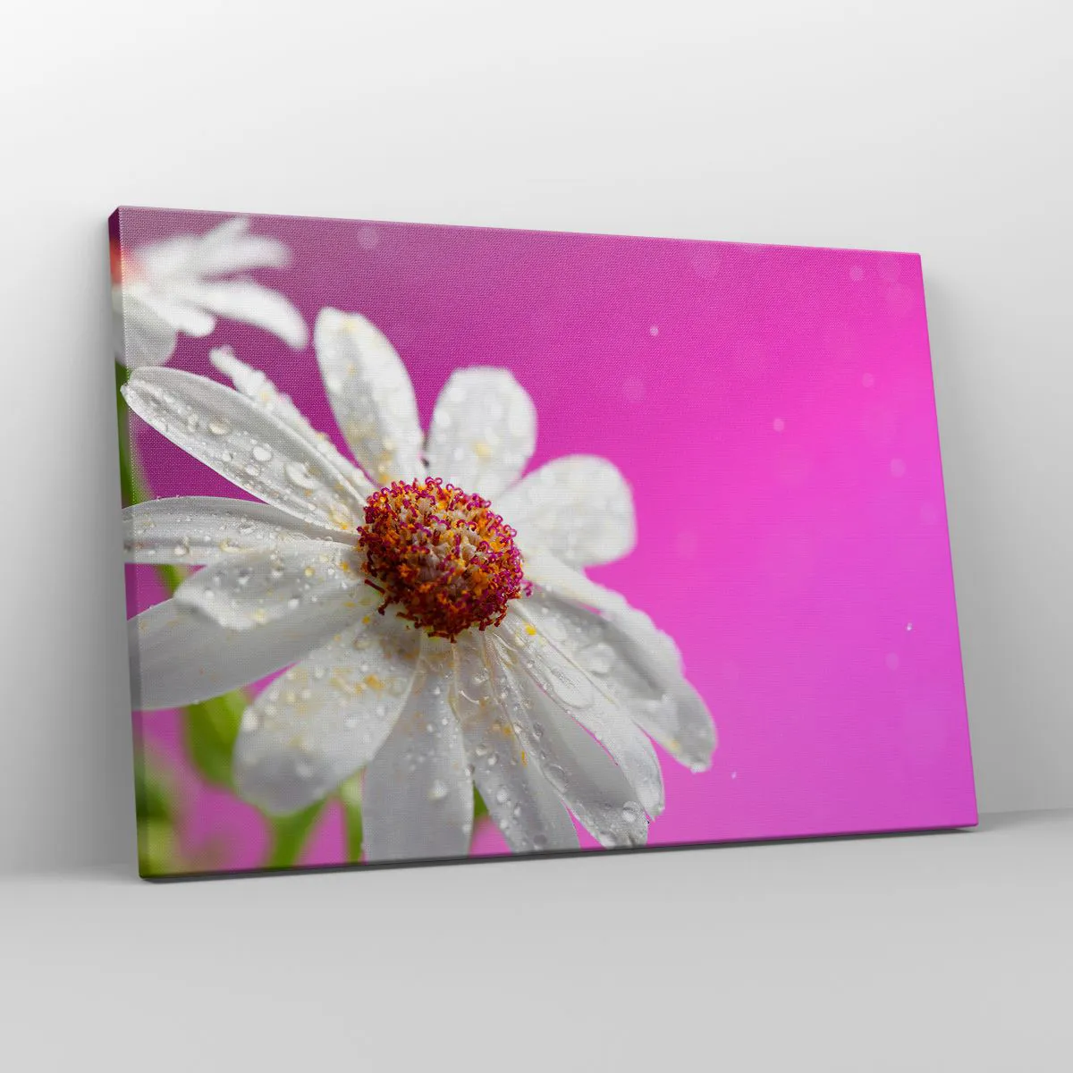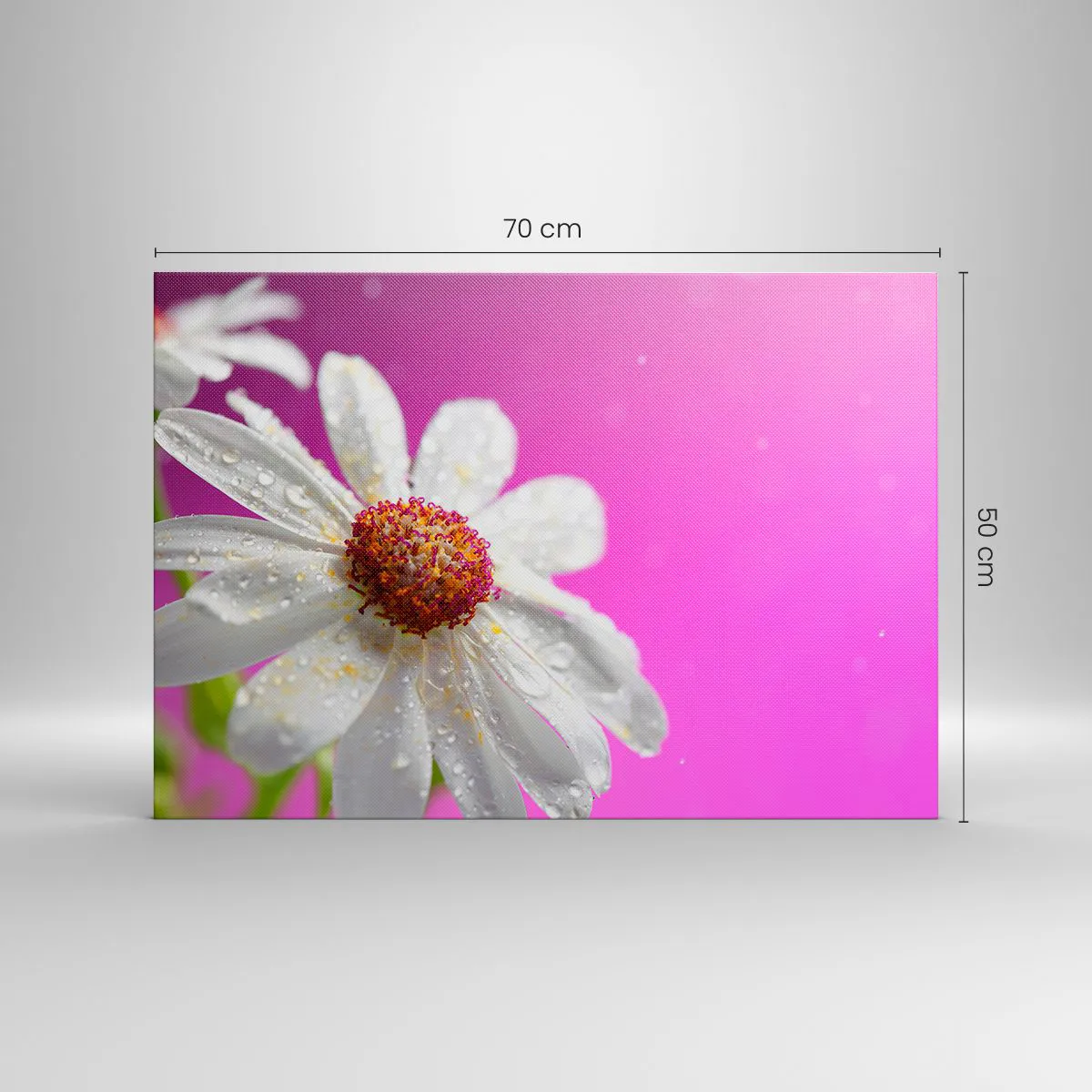 - The painting depicts a white daisy covered in water droplets against a vibrant pink background. The delicacy and harmony of the motif bring freshness to the interior.