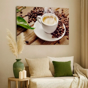 Canvas picture - A cup of aromatic coffee against the background of beans and a leaf - 70x50cm - Coffee Is Served - Modern wall decoration for the living room and bedroom ARTTOR