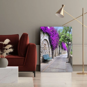 Canvas picture - A stone path with a bench and blooming purple flowers - 70x50cm - Let's Meet - Modern wall decoration for the living room and bedroom ARTTOR