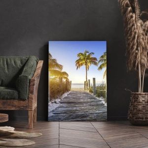 Add a unique tropical-inspired accent to your interior with this original decoration. The painting "Wooden path on the beach with palm trees in the background" is an excellent choice for people who value the beauty of nature and harmony in decorative art.