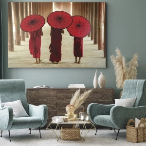 - This painting depicts three monks with red umbrellas surrounded by traditional architecture. A decorative element that brings harmony and spirituality to interiors.