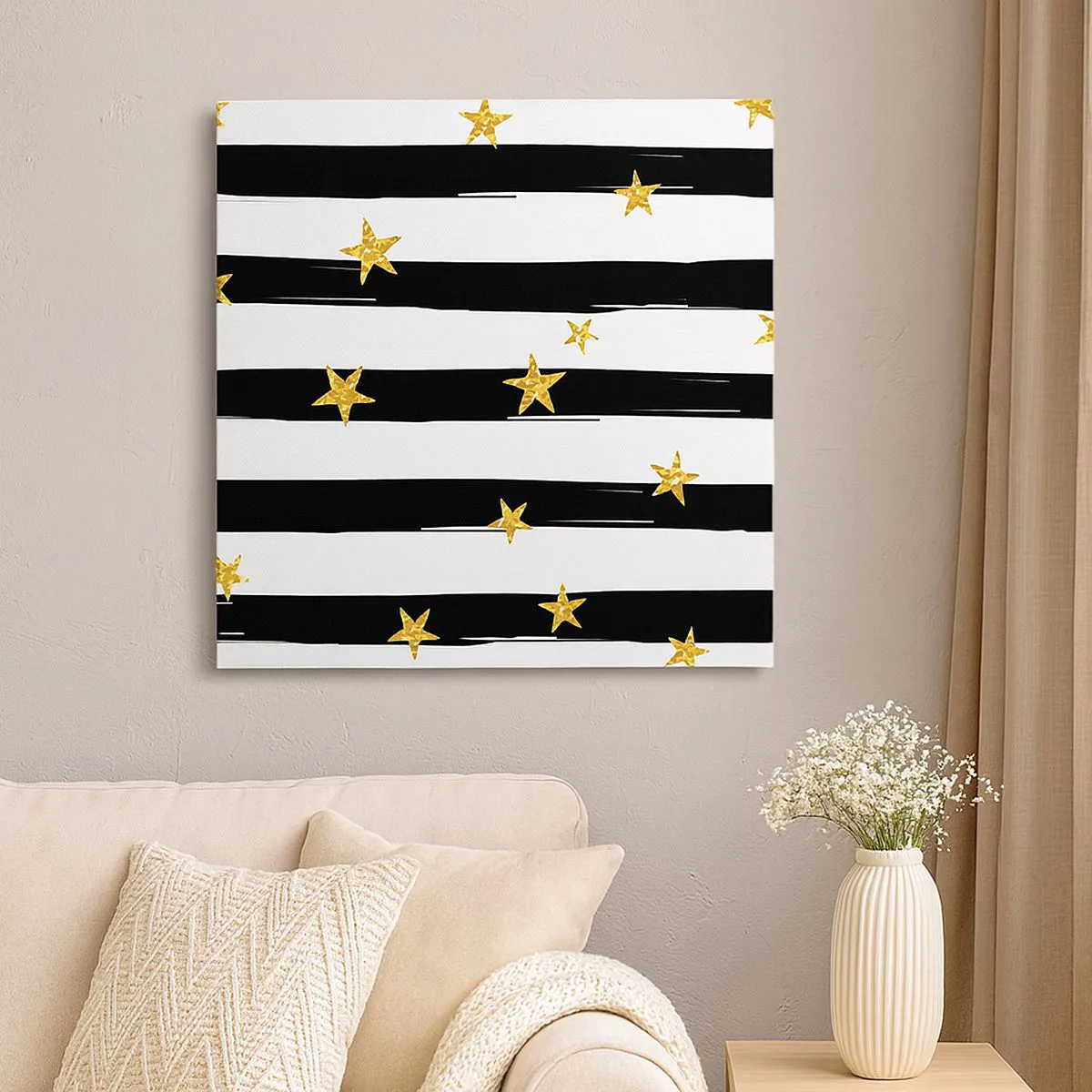 The canvas is stretched over the frame. The sides and edges of the picture are printed to form a continuation of the image. The painting is ready to hang on the wall. Each product comes with a hanger attached to the frame and a mounting kit (screw + wall plug).