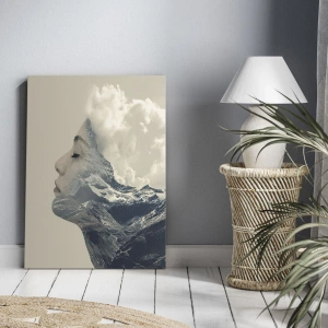 Double exposure is a symbol of harmony between humans and nature. The delicate lines of the woman's face combine with the severity of the mountain landscape, creating a coherent whole that exudes peace and a profound message. This type of work of art fits perfectly into modern, minimalist interiors, giving them an artistic expression.