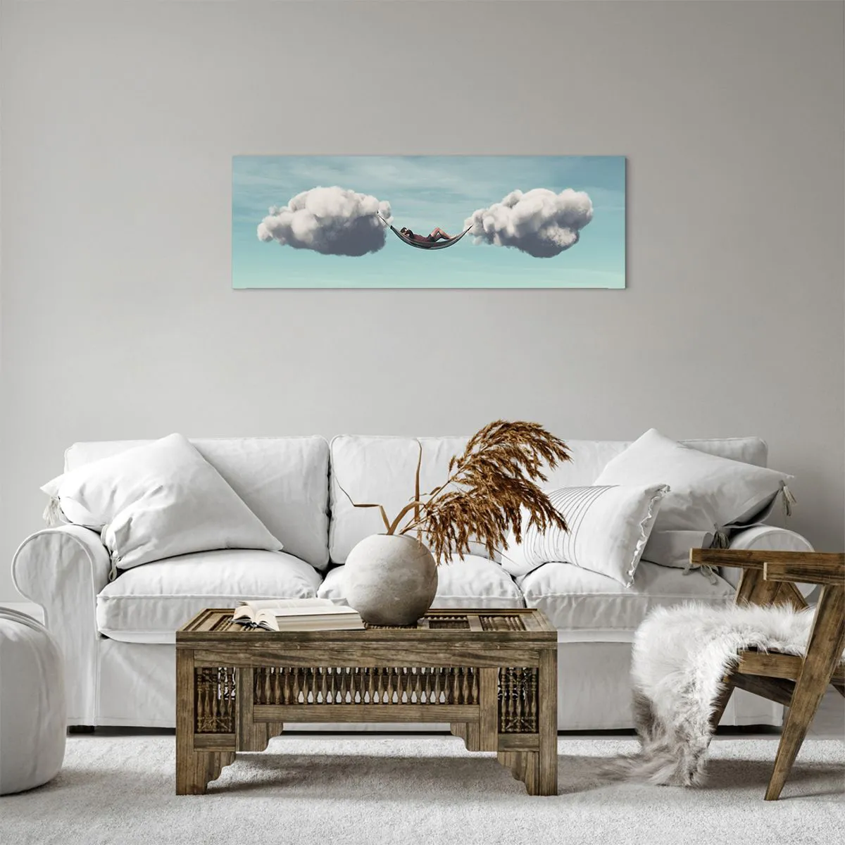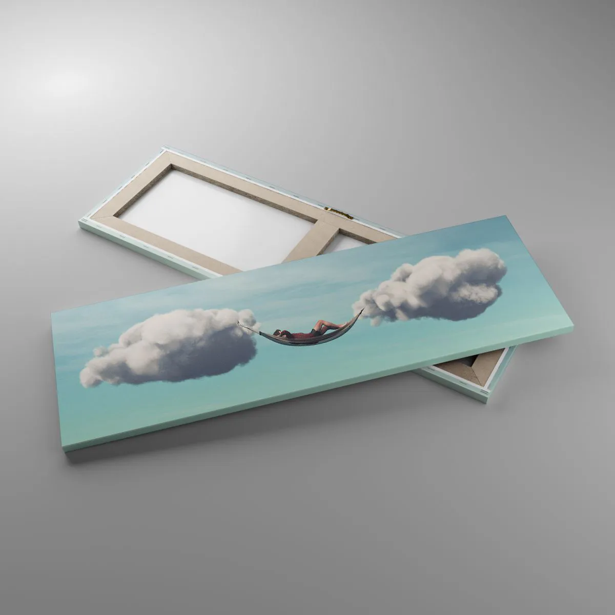 The canvas is stretched over the frame. The sides and edges of the picture are printed to form a continuation of the image. The painting is ready to hang on the wall. Each product comes with a hanger attached to the frame and a mounting kit (screw + wall plug).