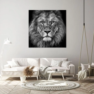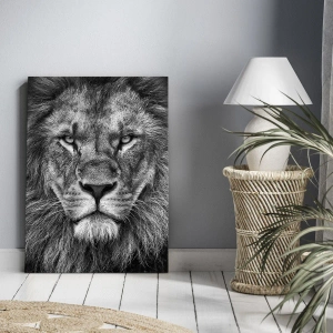 The canvas painting "In coronation robes" is a unique work of art that captures the majesty and power of nature. The 70x50 cm horizontal canvas features a portrait of a lion in black and white. The details of the mane and expressive gaze give the composition elegance and power, making the painting a unique decorative element.