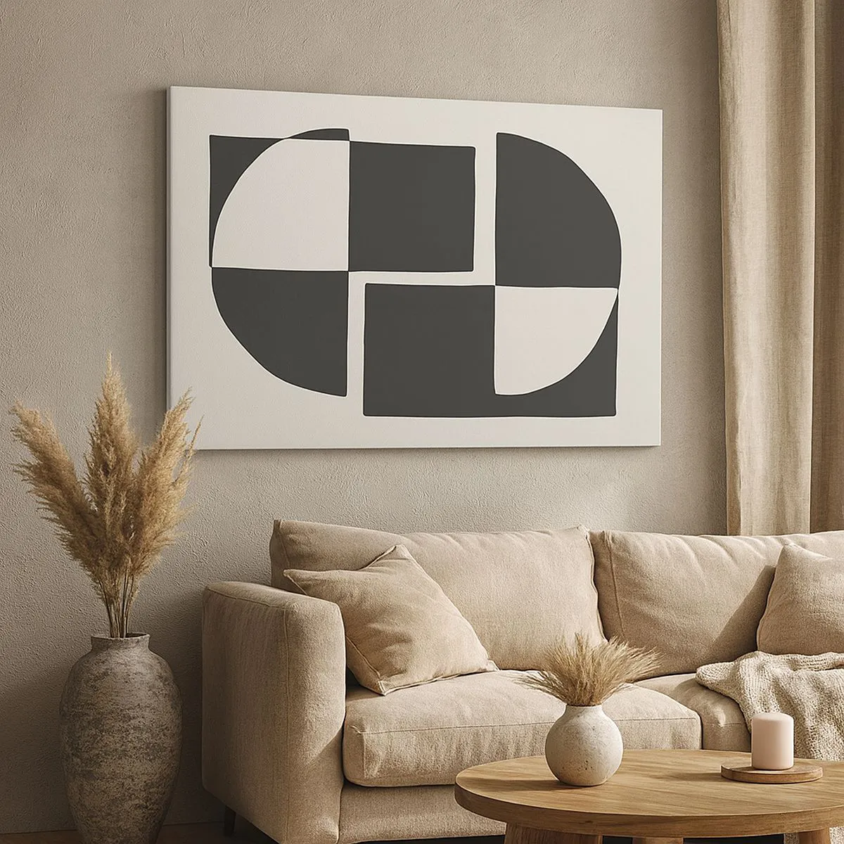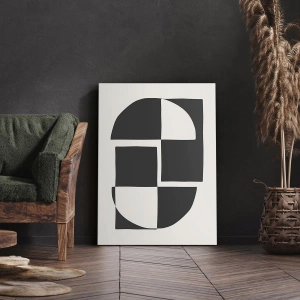 - The "Antithesis – Synthesis" canvas print features geometric abstract shapes in contrasting black and white. It's a perfect addition to modern and minimalist interiors.