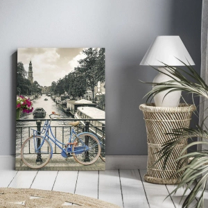 - This 70x50 cm canvas print depicts a picturesque bridge with bicycles and flowers over a canal in Amsterdam. Perfect for interiors that appreciate atmospheric and artistic decorations inspired by European landscapes.