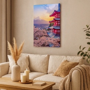 The canvas painting "Pagoda and Cherry Blossoms" is a beautiful combination of traditional Japanese architecture with the natural beauty of the landscape. It depicts a charming pagoda surrounded by blossoming cherry trees against the backdrop of the majestic Mount Fuji, illuminated by the warm light of the rising sun. This motif captures the essence of Japanese harmony and peace.