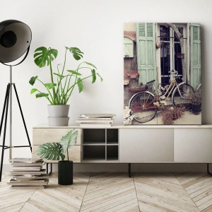 - The painting depicts two vintage bicycles positioned in front of a wooden door with pastel shutters. Rustic details, such as flowers and carefully selected decorations, complete the look, lending a warm, Provençal feel.