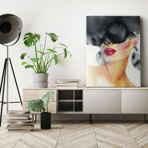- An artistic watercolor portrait of a woman wearing elegant glasses and large earrings. A perfect choice for modern interiors, such as a living room or office.