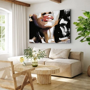 - A portrait of a woman in a dynamic and expressive painting style, revealing facial detail against a contrasting, dark background. Perfect for decorating modern interiors. The canvas print measures 70x50 cm.