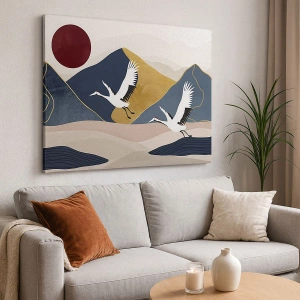 - This subtle 70x50 cm canvas print depicts cranes in flight against a backdrop of mountains and a red sun. Perfect for Asian-style interiors, it brings peace and harmony.