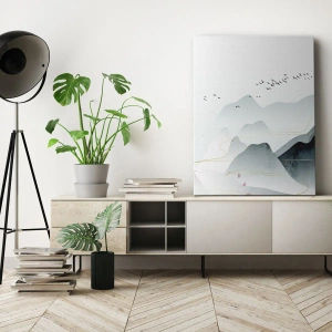 The painting is distinguished by its minimalist style, in which the simplicity of form is combined with sophisticated colors. Pastel tones, such as pink and green, symbolize nature and relaxation, while light lines give the whole thing dynamics and depth. The mountain motif introduces a note of natural beauty and timeless aesthetics to the room.