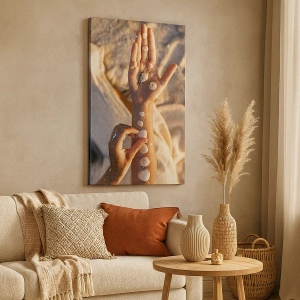 - A subtle painting depicting hands holding seashells against a sandy background. Its minimalist style brings harmony and inspiration to any interior. A perfect choice for a bedroom or living room.