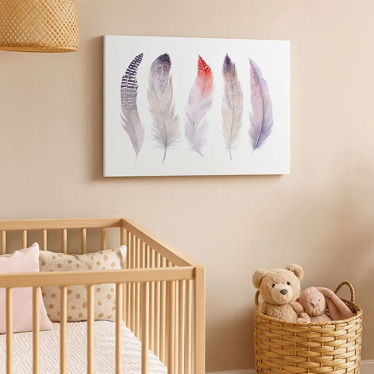 The composition of feathers delights with its harmony and elegance. Each feather has been carefully reproduced, reflecting its unique patterns and textures. Pastel colors give the painting a subtle and calming tone, making it a perfect fit for minimalist, Scandinavian, or boho-style interiors.
