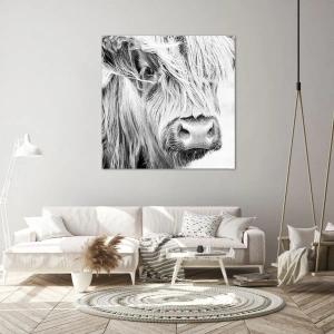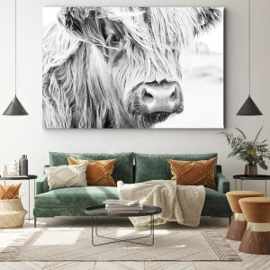 - This black-and-white portrait of a Scottish cow is a minimalist wall decoration that adds a distinctive and artistic touch to any interior.