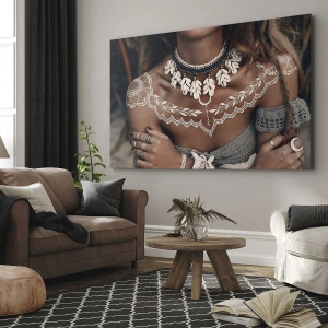 The painting "Boho style with shell jewelry and a lace pattern" is an artistic decoration on canvas measuring 70x50 cm in a horizontal format. It depicts the boho style with jewelry made of shells and a subtle lace pattern, which together create a delicate and elegant composition. This decoration fits perfectly into the aesthetics of interiors that value style and harmony.