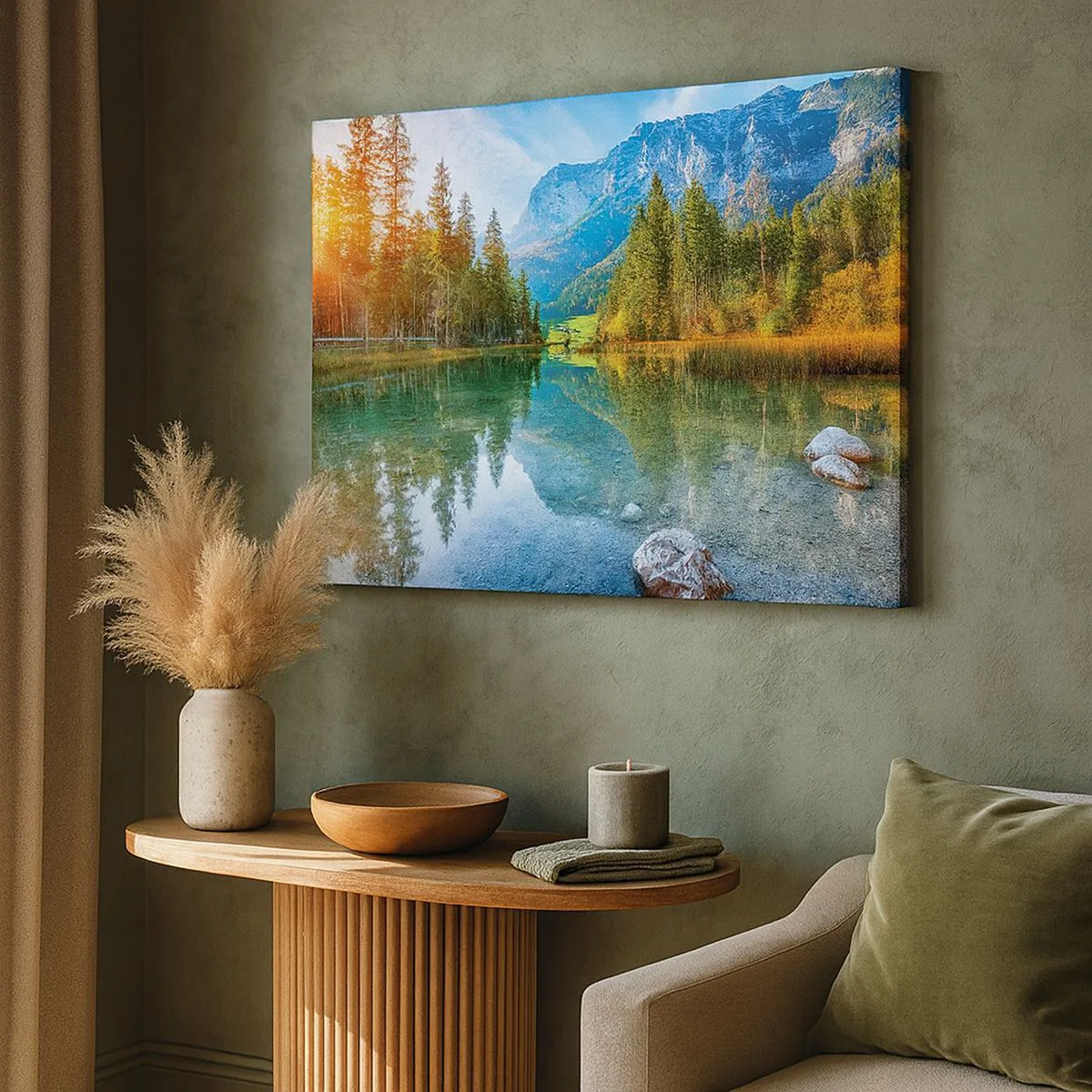 Canvas picture - A picturesque lake surrounded by mountains and forests - 70x50cm - Mellow Autumn - Modern wall decoration for the living room and bedroom ARTTOR
