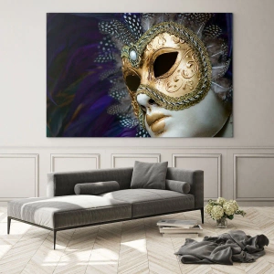 Glass picture - Gold Venetian mask with feathers on a purple background - 70x50cm - Venetian Portrait In Gold - Modern wall decoration for the living room and bedroom ARTTOR