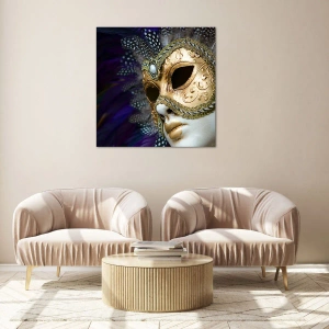 This Venetian mask, symbolizing carnival and art, stands out for its beautiful ornamentation and harmonious combination of colors. Delicate feathers and a contrasting background emphasize the unique character of the painting, making it an excellent choice for interiors with a sophisticated style.