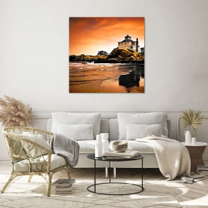 The view of the house on the cliff surrounded by rocks and calm sea waters brings peace and tranquility. Reflections of light on the water and the warm shades of the setting sun add exceptional depth and elegance to the entire piece. It's the perfect choice for those seeking decoration that will bring a relaxing atmosphere and natural beauty to their interiors.