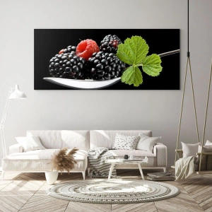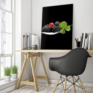 Glass picture - Raspberries and blackberries on a spoon with a green leaf on a black background - 70x50cm - Taste of Freshness - Modern wall decoration for the living room and bedroom ARTTOR