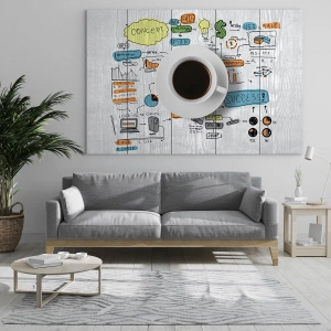 Colorful diagrams, full of notes and drawings, on a white wooden background emphasize the modernity and dynamism of the design, giving the painting a unique character. The coffee motif adds an element of relaxation to the interior, reminding us of moments of concentration and creativity over a cup of our favorite beverage.