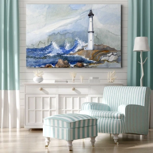- This watercolor painting depicts a lighthouse on a rocky shore surrounded by a turbulent sea. Perfect for nature-inspired interiors.