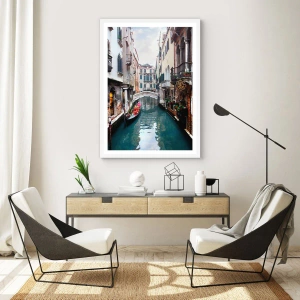 Poster in white frmae - Venetian View with a Gondola and a Bridge - 61x91 cm