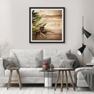 - This poster features an olive branch with ripe olives against a wooden background, creating a rustic and natural motif. A perfect choice for nature-inspired interiors.