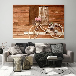 - This glass print depicts a bicycle with flowers against a wooden wall. Its rustic, retro style with a romantic touch is perfect for cozy interiors.