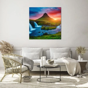 This 70x50cm glass art print, titled Iceland - Fire and Water, is a unique scene depicting the Icelandic landscape. The painting depicts a majestic mountain, volcanic terrain, a waterfall, and lush vegetation. The setting sun illuminates the entire scenery, giving it intense, warm colors. The "water" motif in the form of a waterfall contrasts with the "fire" of the volcano and the energy of nature, creating a dynamic and vibrant composition.