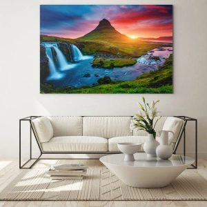 The Iceland - Fire and Water decoration is an excellent choice for those who want to introduce wild, amazing nature and unique landscapes into their interior. The painting is perfect for interiors in a modern, ecological, or nature-inspired style. The motif of mountains, waterfall, and volcano evokes a sense of adventure and connection with the elements.